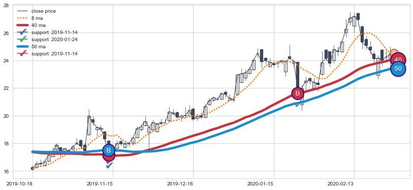 上涨趋势2019-10-18-2020-02-27,均线40, 50确认关键支撑2处