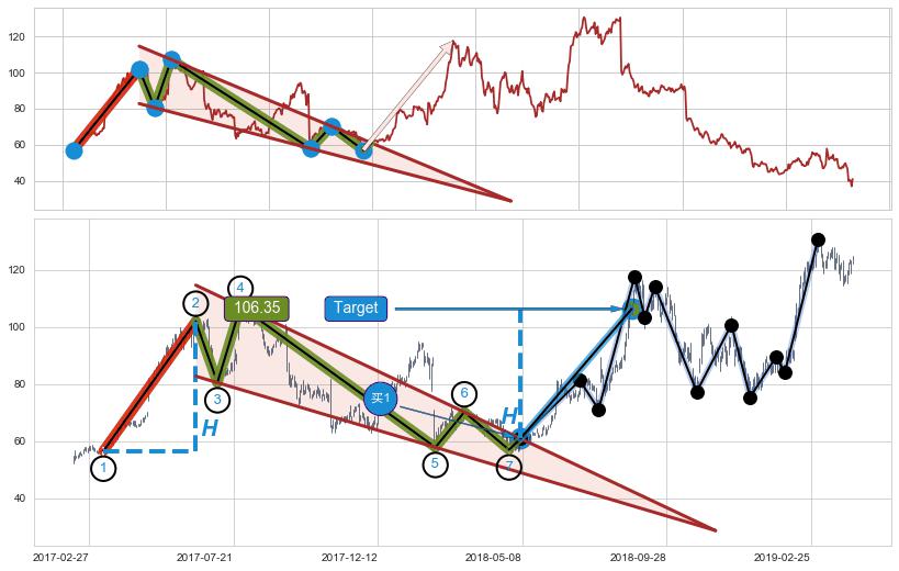 ➢ 最小中继整理涨幅→𝐇: 45.38 (𝐇楔型旗杆的长度:楔型起点→顶点)