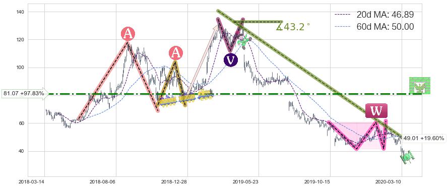 ♘ 阻力价格位81.07,可信任强度61.53%,距离最后交易2020-03-13形成的收盘价格40.98相差 +97.83%