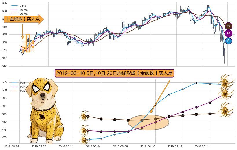 ⚀ 2019-06-10日显现 5日-10日-20日均线 【金蜘蛛】买入点 看多信号,后市看涨,买入