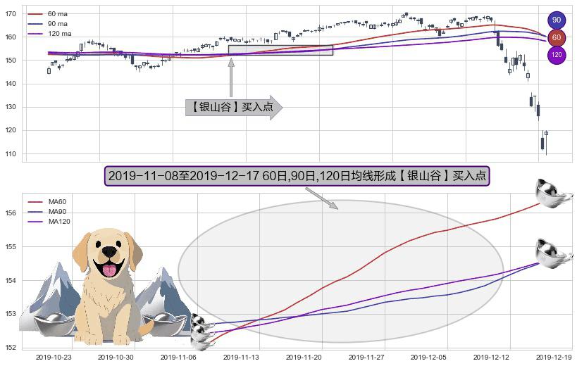 形态多维评估: ⚀ 2019-11-11-日至2019-12-17-日显现 60日-90日-120日均线 【银山谷】买入点 看多信号,后市看涨,买入
