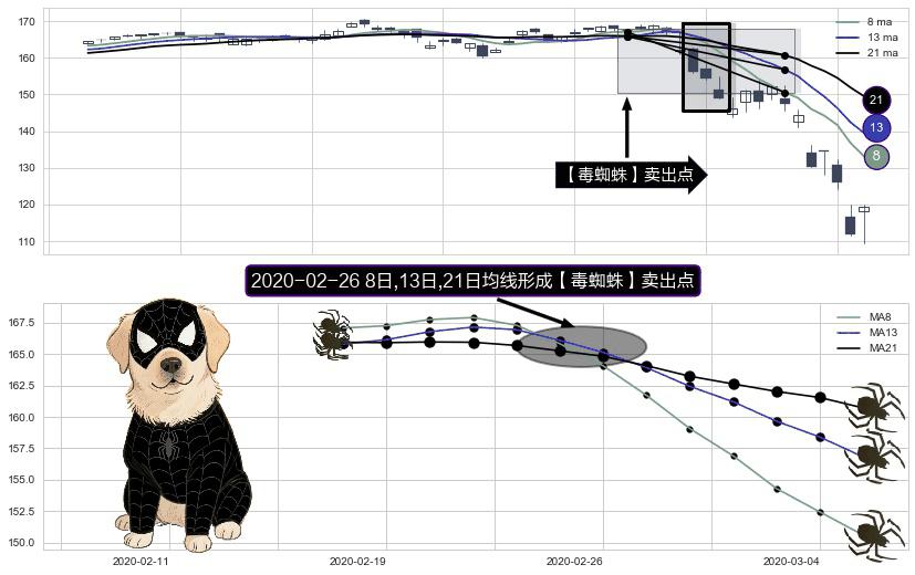 形态多维评估: ⚀ 2020-02-26日显现 8日-13日-21日均线 【毒蜘蛛】卖出点 看空信号,后市看跌,卖出