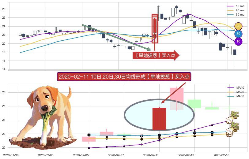 形态多维评估: ⚀ 2020-02-11日显现 10日-20日-30日均线 【旱地拔葱】买入点 看多信号,后市看涨,买入