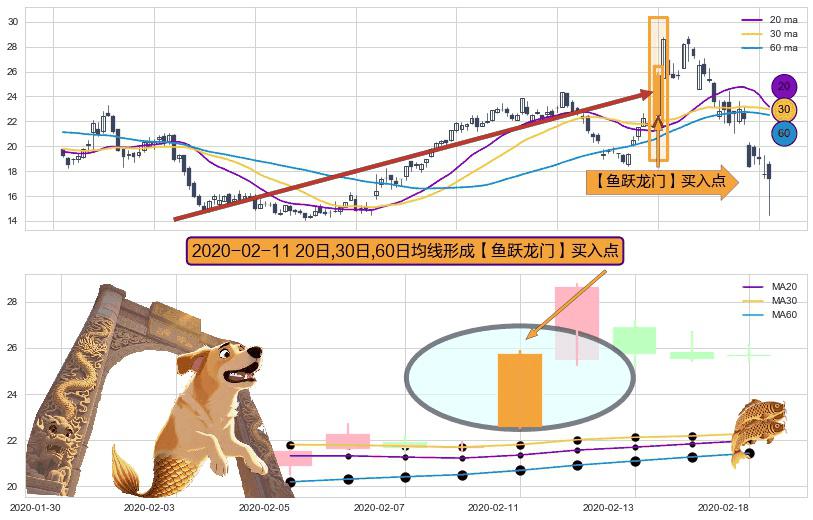 形态多维评估: ⚀ 2020-02-11日显现 20日-30日-60日均线 【鱼跃龙门】买入点 看多信号,后市看涨,买入