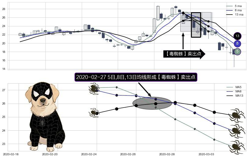 形态多维评估: ⚀ 2020-02-27日显现 5日-8日-13日均线 【毒蜘蛛】卖出点 看空信号,后市看跌,卖出