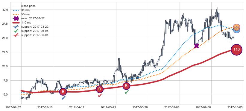 上涨趋势2017-02-02-2017-10-03,均线110确认关键支撑3处