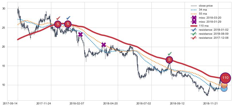 下跌趋势2017-09-14-2018-11-28,均线110确认关键阻力3处