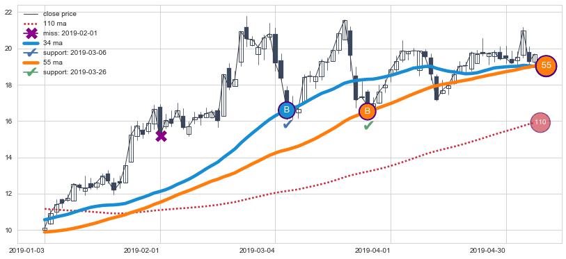 上涨趋势2019-01-03-2019-05-07,均线34, 55确认关键支撑2处