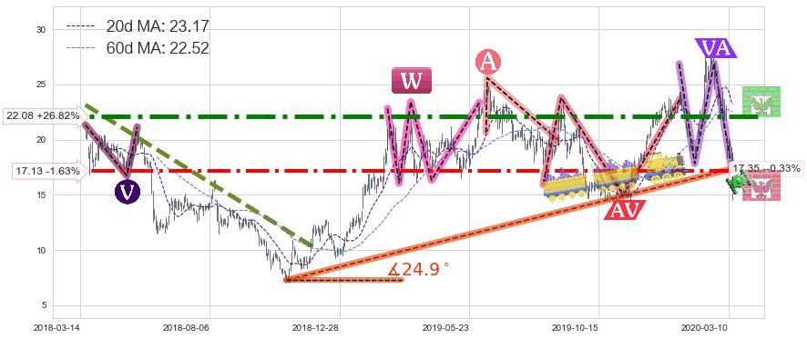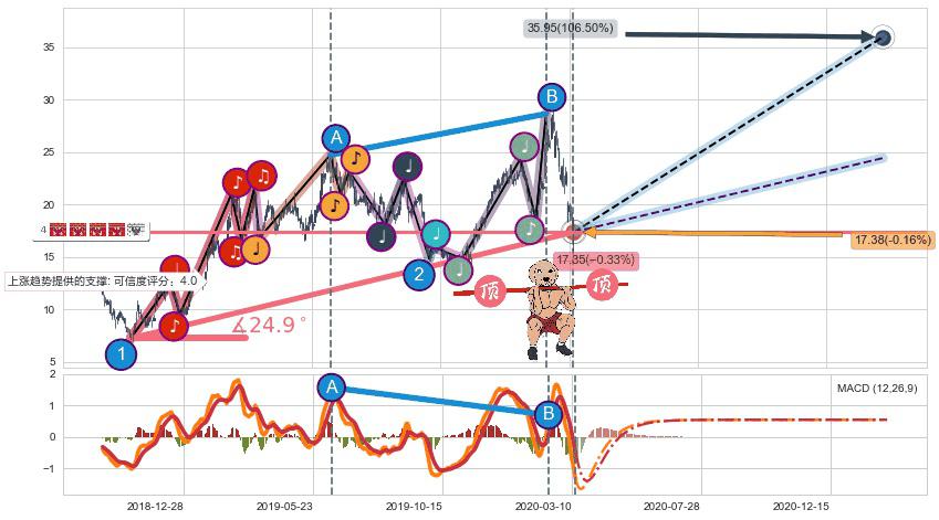 ♘ 支撑价格位17.13,可信任强度83.23%,距离最后交易2020-03-13形成的收盘价格17.41相差 -1.63%
