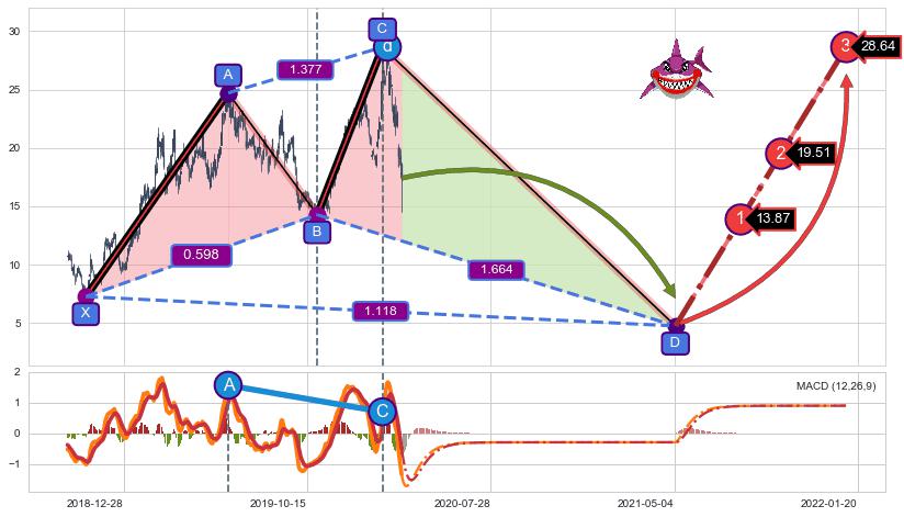 ➢ 距离预测D点位置有足够的下跌空间, 与看涨【鲨鱼】形态相反,实际方向【看跌】
