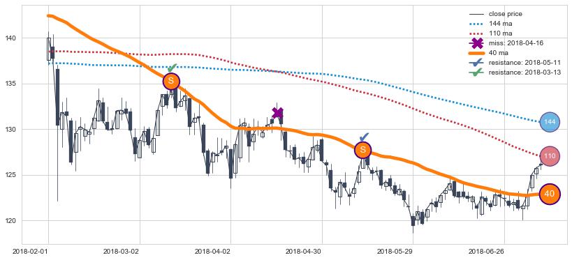 下跌趋势2018-02-01-2018-07-09,均线40确认关键阻力2处