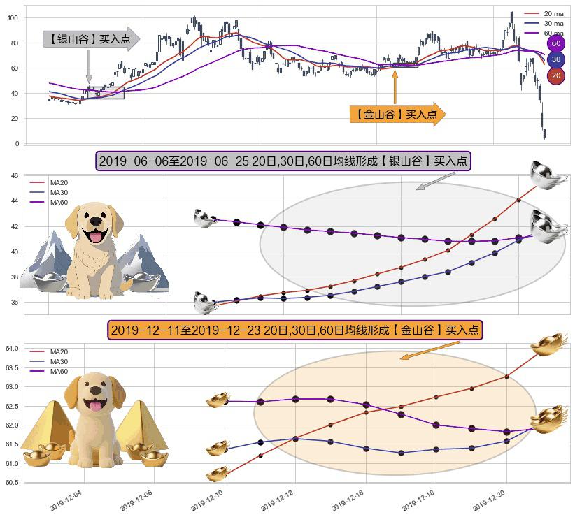 ⚃ 2019-12-12-日至2019-12-23-日显现 20日-30日-60日均线 【金山谷】买入点 其再次确认了买入信号,可靠性更强,买入