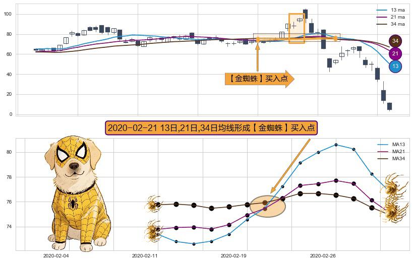 形态多维评估: ⚀ 2020-02-21日显现 13日-21日-34日均线 【金蜘蛛】买入点 看多信号,后市看涨,买入