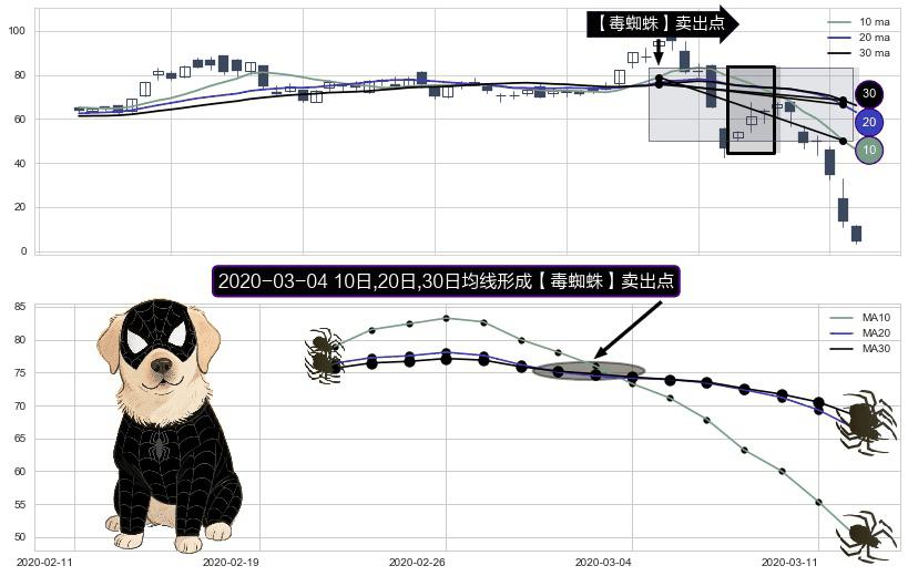 毒蜘蛛三线标准形态的毒蜘蛛是三线死叉于一点,说明三条均线周期内买入的交易者都看空后市,也就在这一天,股价或指数站到三条均线之下,后市看空,可与其它量化信号共同进行决策