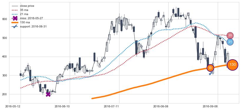 上涨趋势2016-05-12-2016-09-12,均线130确认关键支撑1处