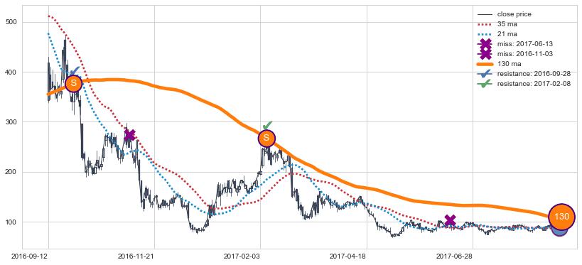 下跌趋势2016-09-12-2017-08-21,均线130确认关键阻力2处