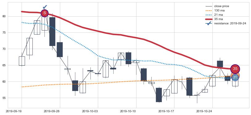 下跌趋势2019-09-19-2019-10-29,均线35确认关键阻力1处