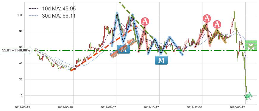 ➢ 收盘价(2020-02-28: 46.74 )→回踩→第一根k线高点(2020-02-18: 82.45 )