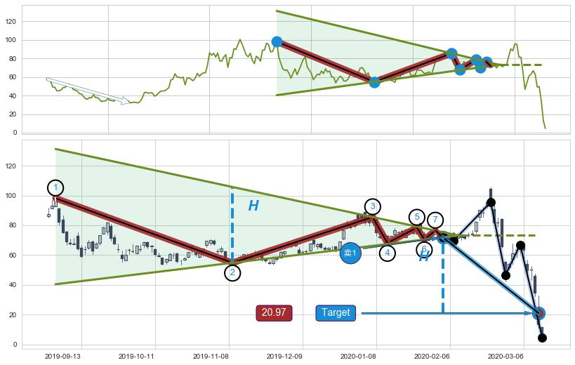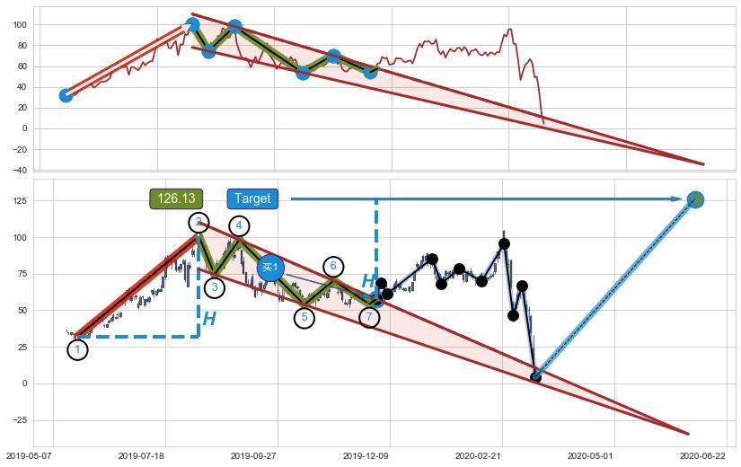 ➢ 最小中继整理涨幅→𝐇: 68.46 (𝐇楔型旗杆的长度:楔型起点→顶点)
