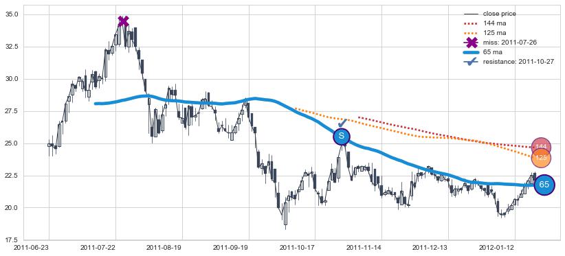 上涨趋势2012-09-17-2014-03-13,均线144, 125确认关键支撑5处