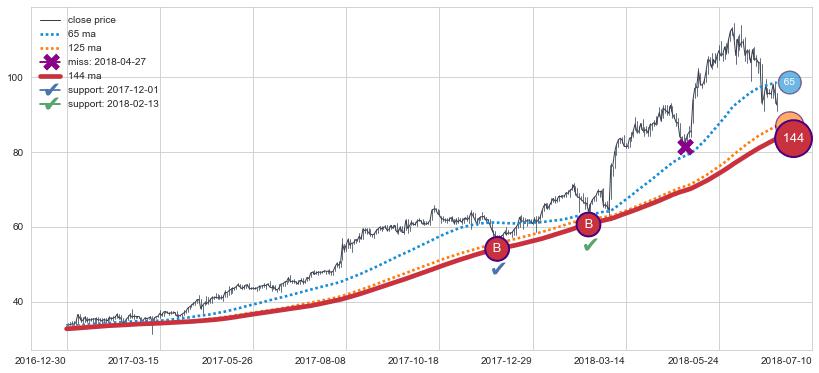 上涨趋势2016-12-30-2018-07-10,均线144确认关键支撑2处