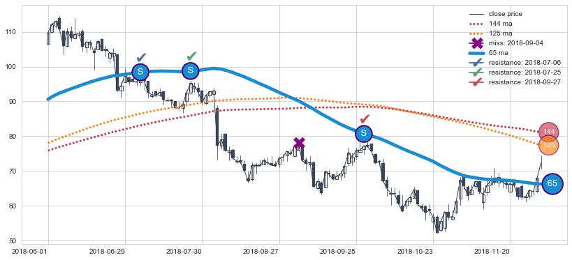 下跌趋势2018-06-01-2018-12-03,均线65确认关键阻力3处