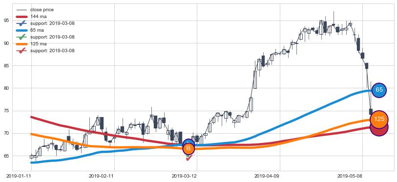 上涨趋势2019-01-11-2019-05-13,均线144, 65, 125确认关键支撑1处