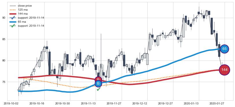 上涨趋势2019-10-02-2020-01-27,均线144, 65确认关键支撑1处