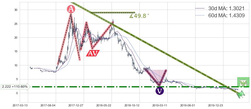 2019-12-31: 时域附近第一阻力位2.222持续的对下跌趋势进行阻拦,有效地放缓了下跌的速度。