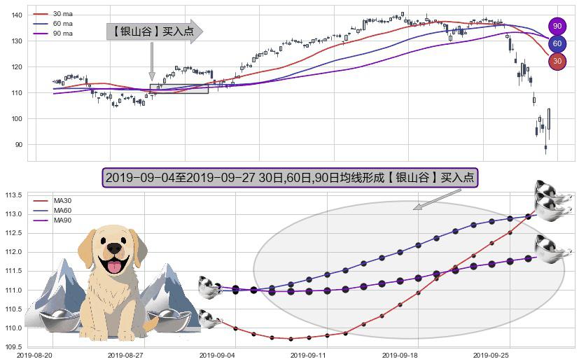 ⚂ 【银山谷】买入点 由MA30均线上穿MA60均线和MA90均线,MA60均线上穿MA90均线形成