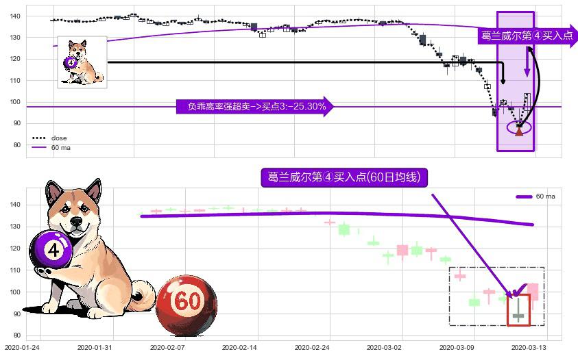 形态多维评估: ⚀ 2020-03-12-日显现 葛兰威尔均线 60日均线 第④买入点 下降趋势均值回复的短线反弹信号,后市看涨,买进信号