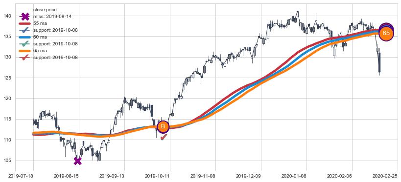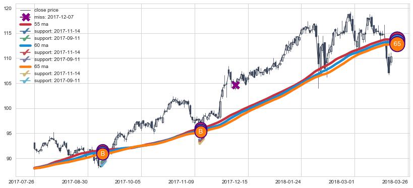 上涨趋势2017-07-26-2018-03-26,均线65, 60, 55确认关键支撑2处