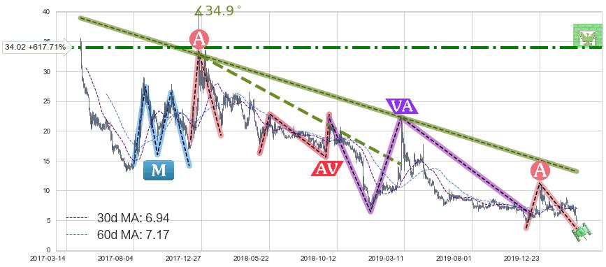 从2017-04-12至2020-03-13,共包含735个交易日,阶段股价下跌-73.32%,阶段股价变动位移路程比: 1 : 35,下跌趋势角度: 34.9