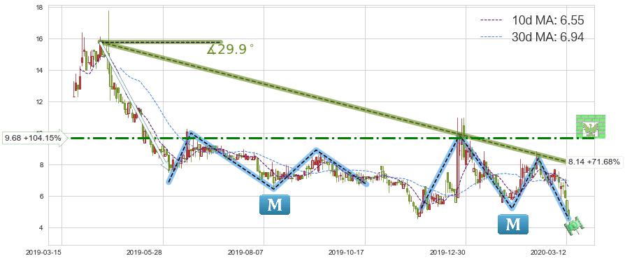 ♘ 阻力价格位9.68,可信任强度68.14%,距离最后交易2020-03-13形成的收盘价格4.74相差 +104.15%