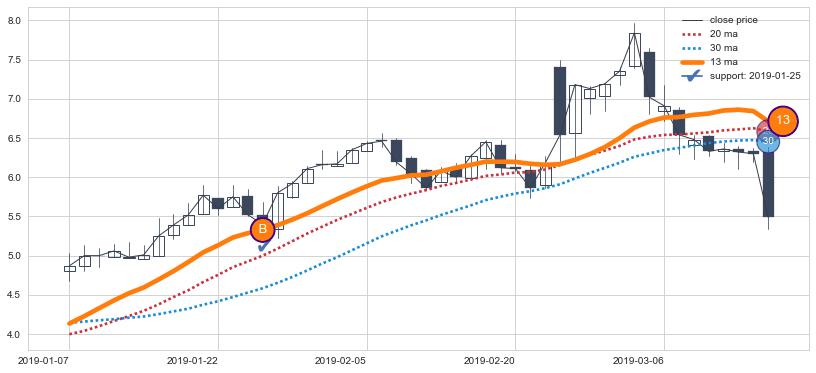 ⚀ 中期均线MA8下穿长期均线MA13形成的交叉是标准 死亡交叉