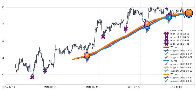 上涨趋势2015-12-16-2016-10-07,均线80, 75, 70确认关键支撑3处