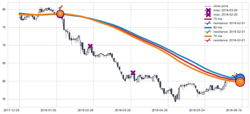 下跌趋势2017-12-29-2018-06-19,均线80, 75, 70确认关键阻力1处