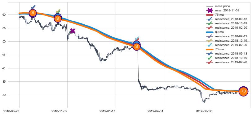 下跌趋势2018-08-23-2019-07-23,均线80, 75, 70确认关键阻力3处