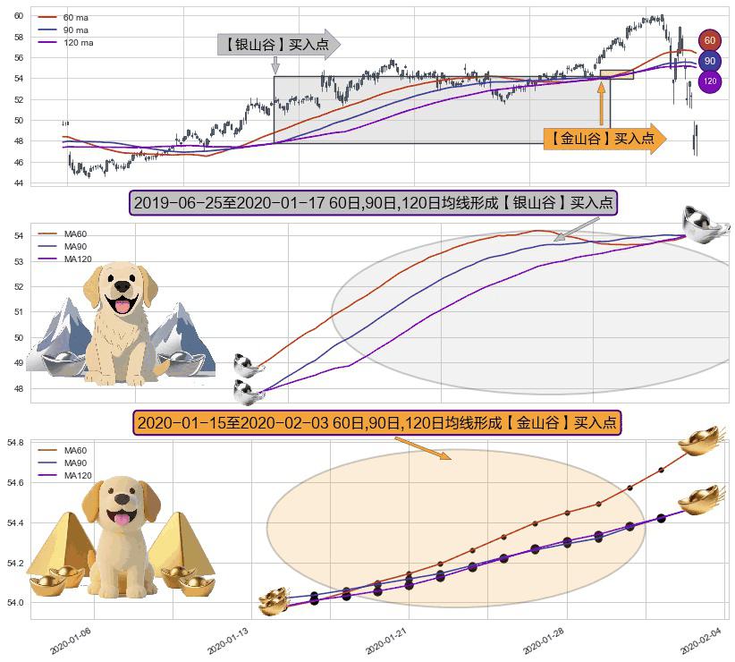 ⚃ 2020-01-16-日至2020-02-03-日显现 60日-90日-120日均线 【金山谷】买入点 其再次确认了买入信号,可靠性更强,买入