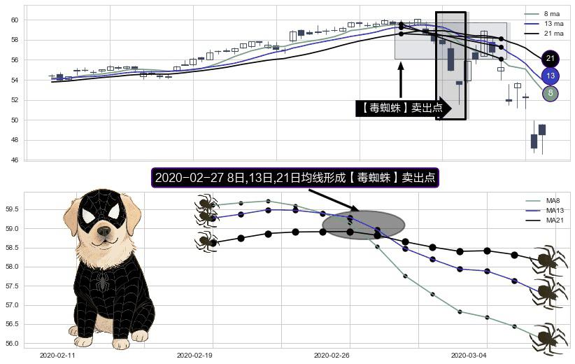 ⚀ 2020-02-27日显现 8日-13日-21日均线 【毒蜘蛛】卖出点 看空信号,后市看跌,卖出