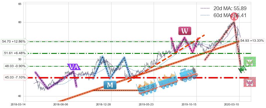 ♘ 支撑价格位45.03,可信任强度94.86%,距离最后交易2020-03-13形成的收盘价格48.47相差 -7.10%