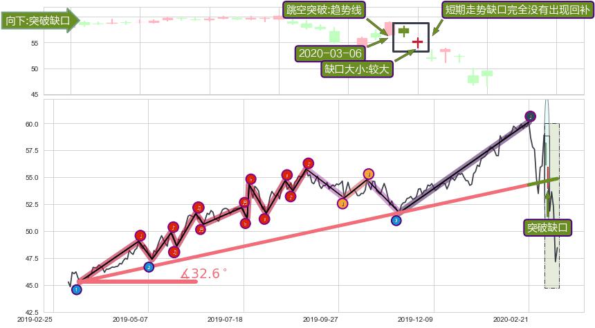 ➣ 2019-03-15-2020-02-21上升趋势存在反转[风险],其原上升趋势的支撑位(54.88)已破位[强阻力信号],原上升趋势角度: 32.6˚