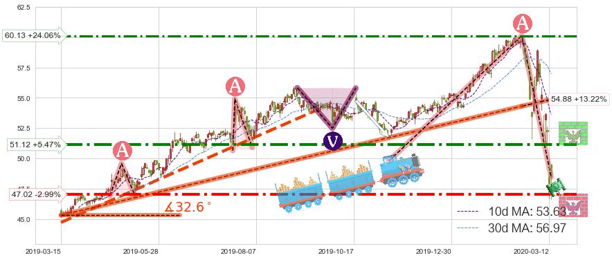 ♘ 阻力价格位60.13,可信任强度57.41%,距离最后交易2020-03-13形成的收盘价格48.47相差 +24.06%