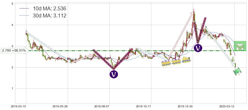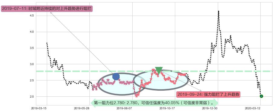 ♘ 阻力价格位2.780,可信任强度40.05%,距离最后交易2020-03-13形成的收盘价格2.010相差 +38.31%