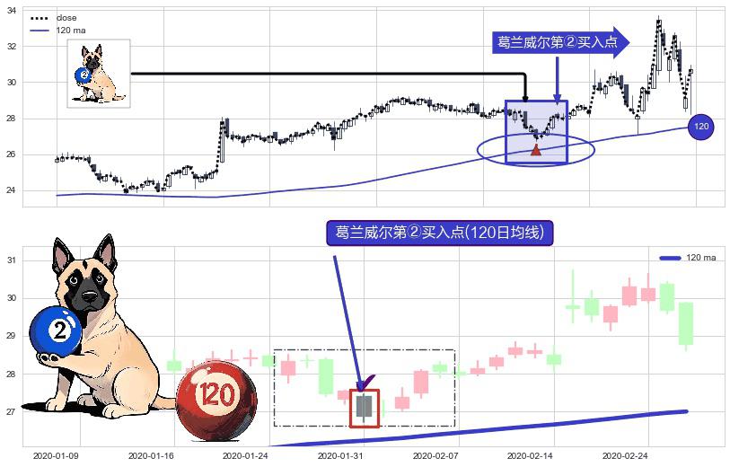 形态多维评估: ⚀ 2020-01-31-日显现 葛兰威尔均线 120日均线 第②买入点 上升趋势的中继信号,后市看涨,买进信号