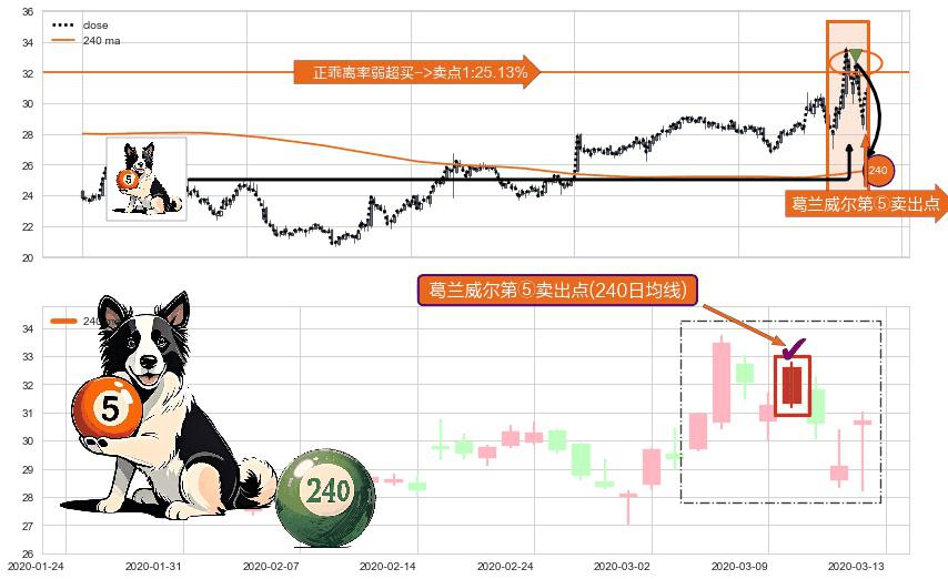 形态多维评估: ⚀ 2020-03-10-日显现 葛兰威尔均线 240日均线 第⑤卖出点 上升趋势均值回复的短线回落信号,后市看跌,卖出信号