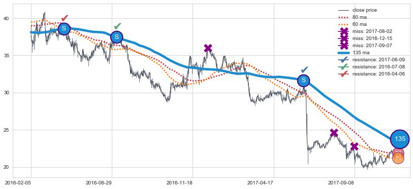 下跌趋势2016-02-05-2017-11-13,均线135确认关键阻力3处