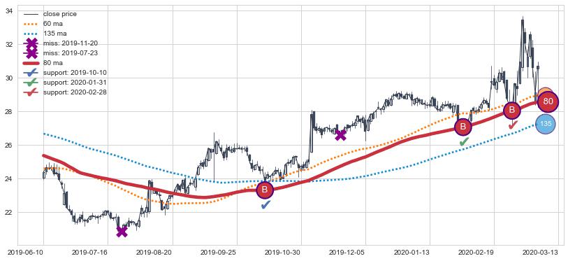 上涨趋势2019-06-10-2020-03-13,均线80确认关键支撑3处