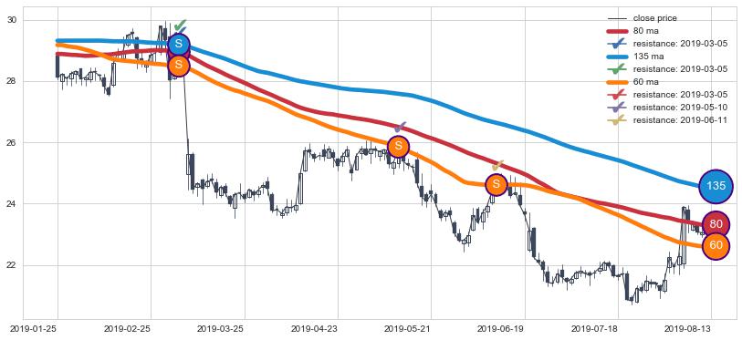 下跌趋势2019-01-25-2019-08-13,均线80, 60, 135确认关键阻力3处
