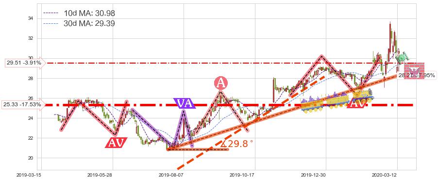 ♘ 支撑价格位29.51,可信任强度37.29%,距离最后交易2020-03-13形成的收盘价格30.71相差 -3.91%
